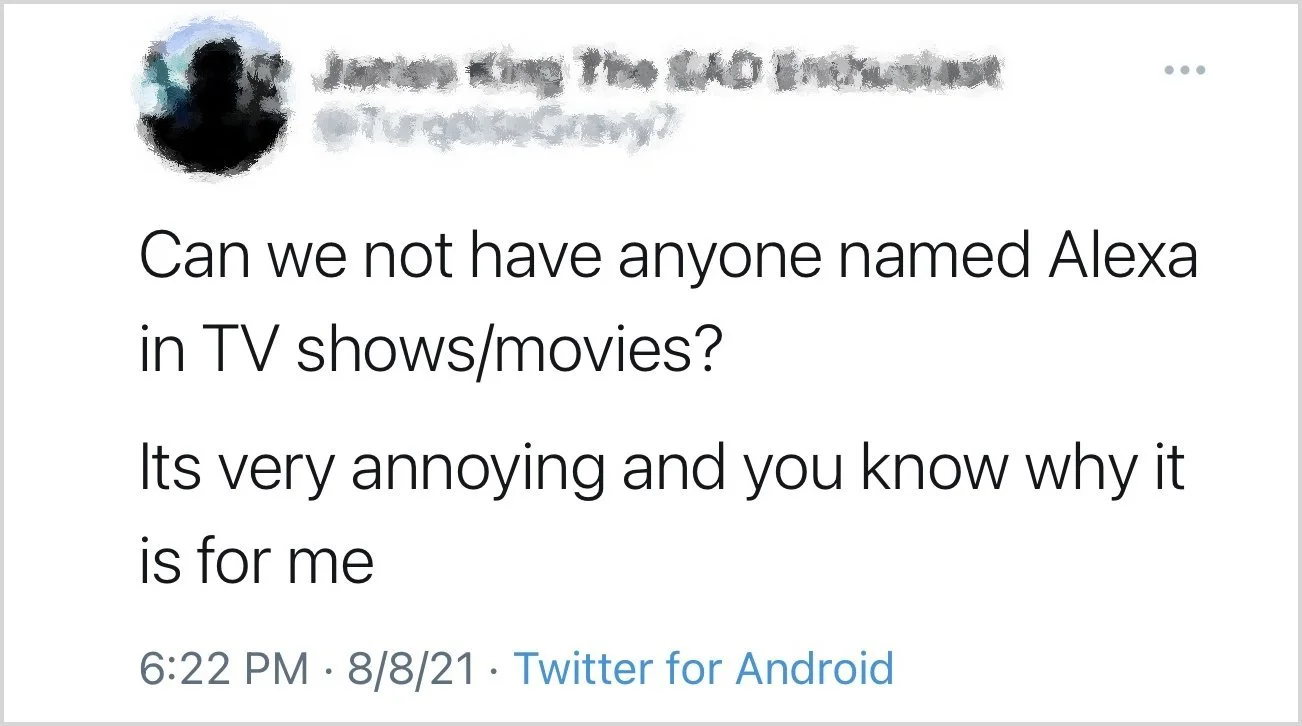When Amazon’s virtual assistant users go on social media to vent about the nuisance of someone in media having the name Alexa (or similar), they often tag the offending show, or the network / streaming service that’s producing and broadcasting it, in the hopes that the people in charge of these productions might see their complaints. Some of these users even mention how this issue is a deal breaker for them as far as continuing to watch the show. Obviously, viewer ratings are very important to most media producers; viewership determines ad revenues, etc. The possibility that this feedback from viewers on social media might actually influence these producers’ future decisions regarding the inclusion of people with “problematic” names is a highly troubling reality.