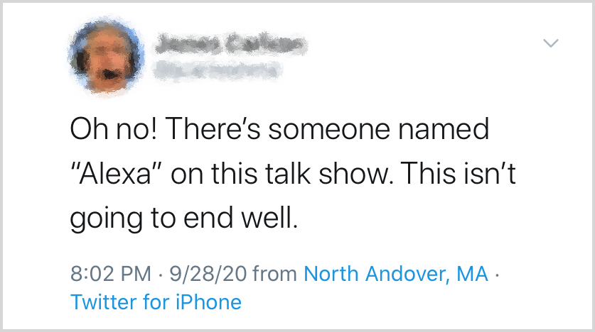 As we saw with distance learning, people named Alexa (and similar) don’t need to actually be in the same physical space as a device with Amazon’s virtual assistant to accidentally activate it and cause chaos and interruptions. In fact, they don’t even need to be interacting directly with device users; accidental activation can happen whenever people named Alexa (and similar names) are included in most types of media, such as TV shows, movies, podcasts, radio shows, and even books that become audiobooks. That means it’s potentially a problem for device users when someone with a “problematic” name is a guest on a talk show, interviewed or discussed in a news story, a contestant in a game show, part of reality TV show, a host or reporter, a character in a fiction or non-fiction book, and so forth.